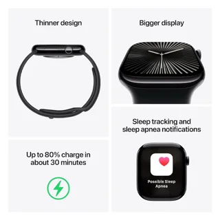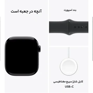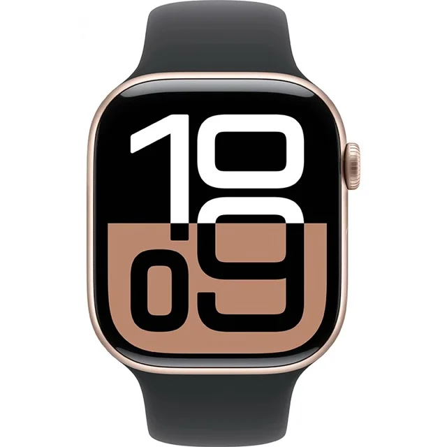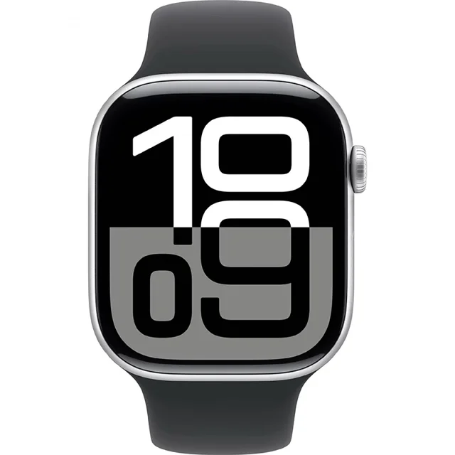 ساعت هوشمند ورزشی و روزمره اپل مدل Series 10 سایز قاب 46 میلیمتر، دارای بند سیلیکون، سازگار با سیستم عامل iOS، دارای سنسورهای شمارنده ضربان قلب، سنجش اکسیژن خون و سنجش دمای بدن، امکان محاسبه میزان کالری مصرفی و ارائه برنامه تمرینی